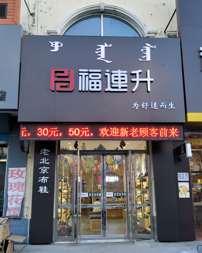在此,福连升健康休闲中年鞋(原福连升(原福联升)老北京布鞋)全体员工祝贺:福连升中年鞋内蒙通辽市科尔沁左翼中旗宝龙山镇二店开业大吉、生意红火、财源广进!诚邀各地有志之士加盟合作,共享辉煌!
