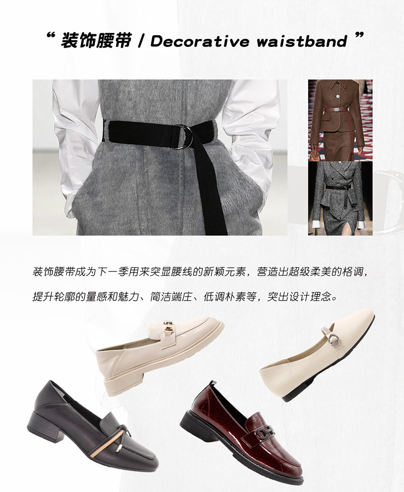 用腰带装饰是鞋服行业的一种新式设计元素,突出整体格调美感和气质的展现,给予成熟优雅的美。