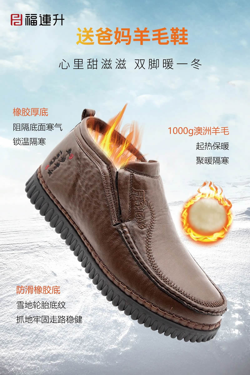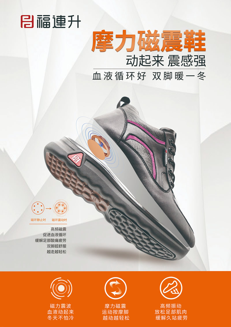 福连升冬季新品打破鞋品科技新思路,专业研发特别推出黑科技摩力磁震鞋、保温暖冬羊毛鞋、安全生活止滑鞋、无惧污渍防水鞋四大板块冬款新鞋品。